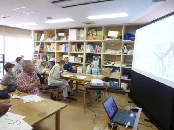 (上)プロジェクター(パワーポイント)を使って、樹木の基礎知識や剪定の仕方の説明状況。