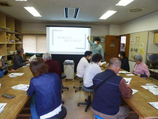 ①岡山市の事業による「桃太郎のまち岡山コンポスト」のPR。家庭内から出る生ごみの堆肥化を行う事業です。