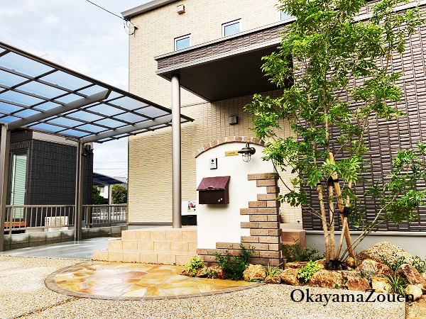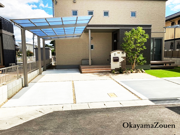 アプローチには、イエロー系のクォーツストーン乱形を縁のプリウスブリック プリコロと組み合わせ、自然石ならではの温かみと上質さを演出しました。駐車スペースの土間は、刷毛引き仕上げとダークイエローの玉砂利を用いた洗い出し仕上げを効果的に使い分け、おうど砂利を敷き詰めた割溝がデザインのアクセントです。カーポートには、ネスカ Fロング柱タイプを採用し、熱線吸収ポリカーボネート板の屋根材が快適な空間を提供します。
