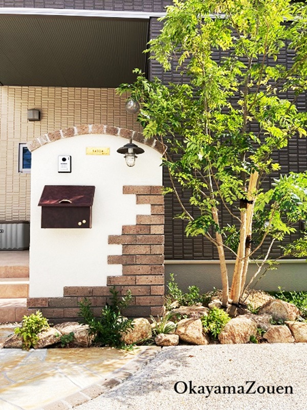 住まいの顔となる門柱は、白を基調とした美ブロシルキーHGの塗り仕上げに、温かみのあるプリウスブリックのレンガを配し、R加工の天端が上品な印象を与えます。ミグノンポスト、真鍮製ポーチライト、株立ちのシマトネリコと割栗石の植栽が一体となり、訪れる人を優しく迎え入れる豊かな表情を創り出しています。