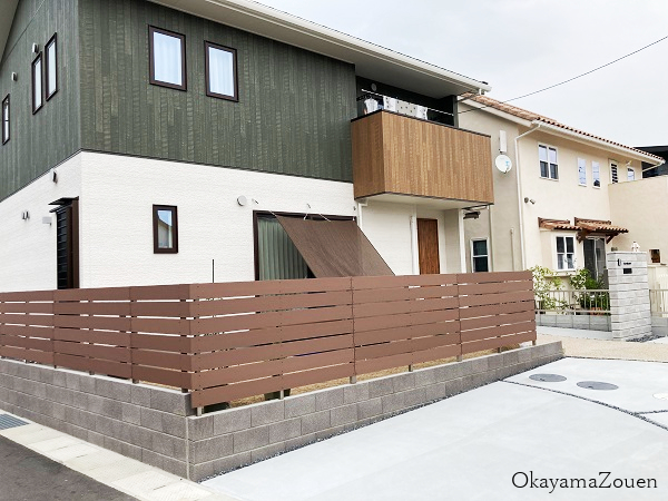 敷地境界には、再生木板を用いたエコモックオリジナルフェンスが横貼りで設置され、プライバシーの確保と同時に、温かみのある木調が外観デザインに調和をもたらしています。足元にはトーヨーイースゼロの境界塀を組み合わせることで、堅牢さとデザイン性を兼ね備えた美しい仕上がりとなっています。