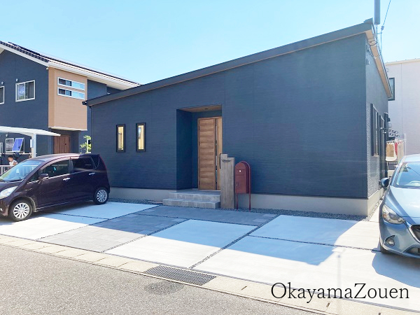 M様邸のエクステリアは、洗練された建物の外観と調和し、機能性とデザイン性を両立させたプランです。ダークトーンの外壁に合わせ、アプローチから駐車スペースまで、全体に統一感のあるすっきりとした印象を創出しました。