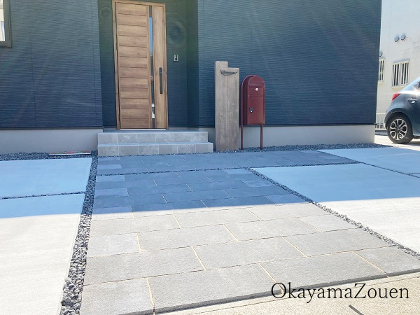 アプローチには、落ち着いた色合いのカルムペイブを採用。濃淡のグレーで奥行きとリズム感を演出し、直線的な砕石敷きが空間をシャープに区切り、洗練された玄関への導入路を形成しています。