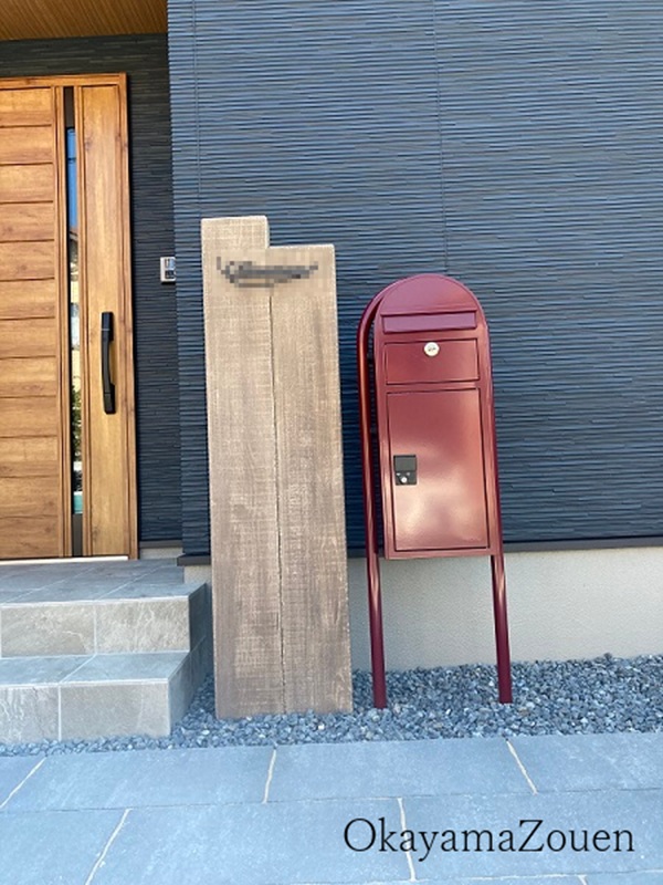 特に目を引くのは、玄関脇のボビカーゴ機能門柱です。ボルドーの色彩がダークカラーの建物とグレーのアプローチに鮮やかなアクセントとなり、郵便ポストと宅配ボックスの機能を兼ね備え、利便性を提供します。隣にはヴィンテージウッド スリーパーラフトにフォレストヒルズネームプレートを設置。木の質感がモダンな空間に温もりを加え、シンプルながらも個性的なエントランスを演出しました。