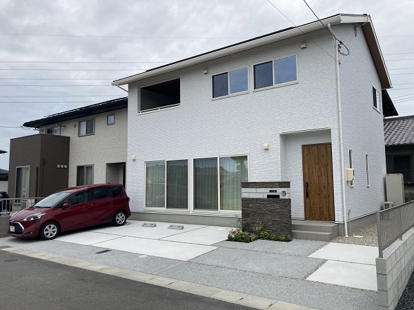 建物周りには防草シートと沼田/ミカゲの化粧砂利を敷設し、美観とメンテナンスの手間を軽減。駐車スペースには使いやすい車止めブロックを配置し、日々の利便性も考慮しています。