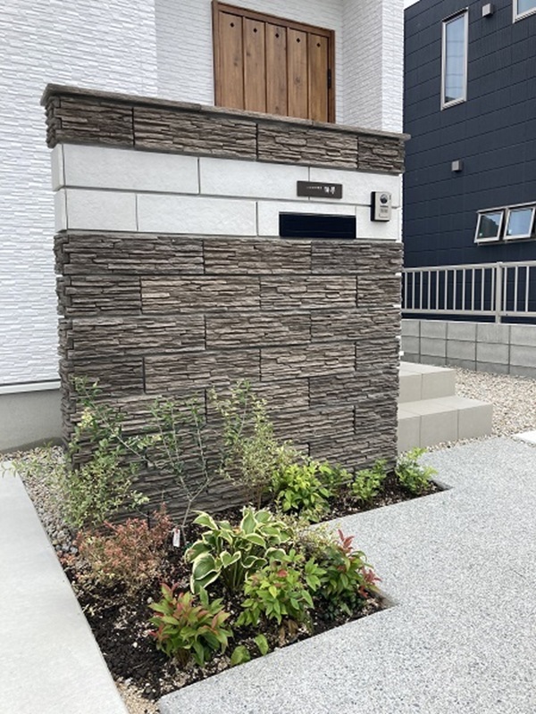 特に目を引く門柱は、異素材の組み合わせによる洗練されたデザインが特徴です。下部に重厚なダルストーンウォール、上部に清潔感のあるレイヤーウォールを配し、コントラストがデザインのポイント。表札、ポスト、インターホン子機が一体化され、機能美も追求しました。