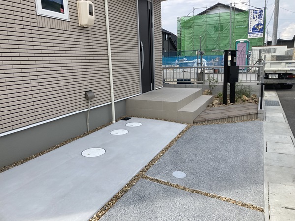 敷地内の舗装は、刷毛引き仕上げコンクリートと洗い出し仕上げジャミコンクリートを巧みに配置。異なる質感の舗装が空間に変化を与え、視覚的な楽しさを添えます。要所の化粧砂利は、美観とメンテナンス性を両立。建物周りは防草シート、化粧砂利、ピンコロ石で、日常のお手入れもしやすい設計です。