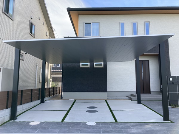 特に目を引くのは、二台分のスペースを確保したカーポートSCです。スタイリッシュなブラックの柱とナチュラルシルバーの屋根材が建物と調和し、屋根下にはダウンライトが美しく埋め込まれ、夜間の安全性と美観を高めます。人感センサー付きのため、利便性も考慮されています。