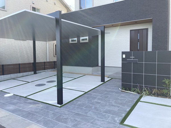 広々とした駐車スペースは、コンクリート打ちと人工芝の割溝を組み合わせることで、デザイン性とメンテナンスのしやすさを両立しました。幾何学的なラインがモダンな印象を与えつつ、スムーズな駐車を可能にする工夫が凝らされています。