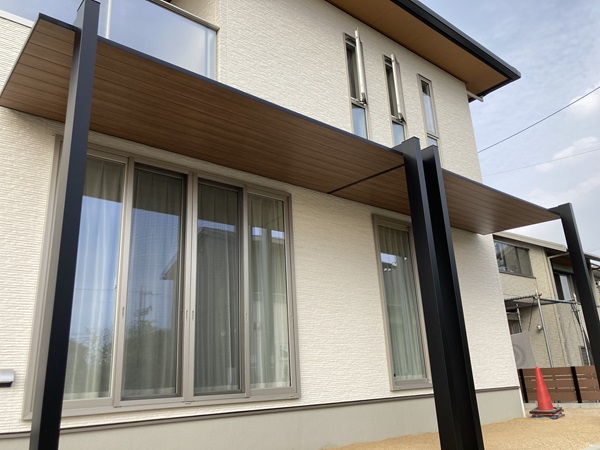 住居のサイドには、セカンドリビングとしても活用できるテラスSCを設置しました。ブラックの柱にブラックとチェリーウッドの屋根材が使われ、特に屋根裏の木目調が温かみと高級感を演出します。外部からの視線を遮りながらも、心地よい開放感を提供する、くつろぎの空間です。
