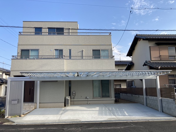 駐車スペースの土間コンクリートは刷毛引き仕上げで、滑りにくさと清潔感を確保。建物周りには防草シートと美しい川砂利を敷き詰め、見た目の美しさと将来的なメンテナンスの軽減にも配慮しています。