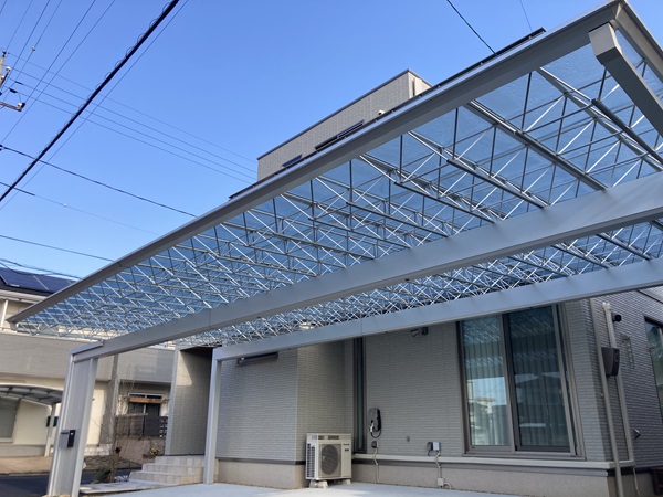 最も目を引くのは、その広大な敷地を活かした印象的なカーポートです。透過性のある屋根材は日中の明るさを確保し、熱線遮断ポリカーボネート板が大切な車両を日差しから効果的に保護します。空に映える繊細な格子デザインは、昼は光と影のコントラストを演出し、夜間は梁下のダウンライトが駐車スペースを明るく照らし、安全性と防犯性を高めます。