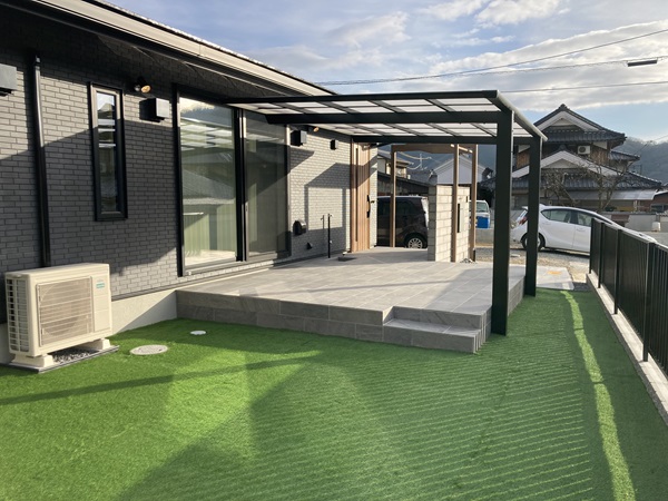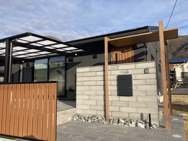 Y様邸のエクステリアは、建物の落ち着いた色合いに調和するよう、全体をモダンで機能的な空間としてデザインしました。