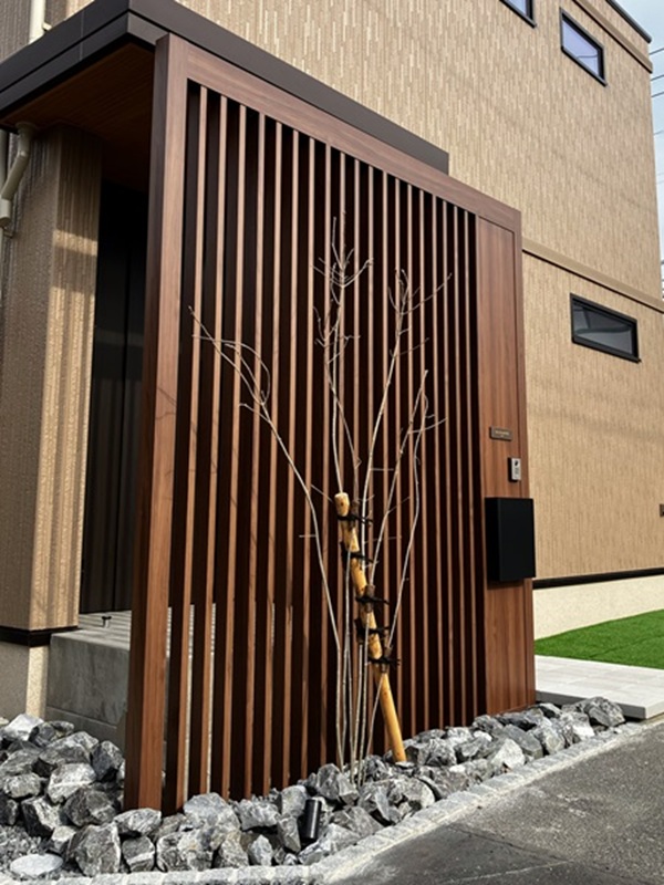 足元には、管理の手間が少ないクローバーターフの人工芝が広がり、その見切りにはエッジマスターが使用されています。これにより、常に手入れされた美しい緑が保たれ、明るい印象を与えます。門柱の根元には、割栗石(田村石材)が据え置かれ、その中からアオダモの株立ちが伸びやかに立つことで、都市の中にも自然の息吹を感じさせるアクセントとなっています。石と植物、そして木調のGフレームが織りなすコントラストが、和モダンな雰囲気を際立たせています。