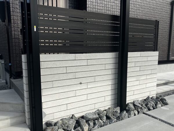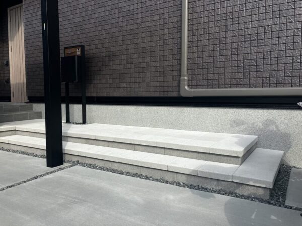 O様邸の外構は、新築のモダンな建物と調和するよう、洗練されたデザインと実用性を両立させました。ダークグレーとホワイトを基調とした色彩が、都会的でシャープな印象を住まいに与えます。二つの「セルフィ」カーポートは敷地形状に合わせたスマートな配置で、単なる駐車スペースを超え邸宅の顔となるスタイリッシュな空間を演出。柱位置の微調整により機能美と使い勝手を両立させています。