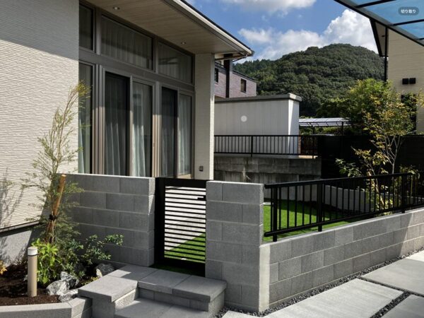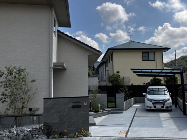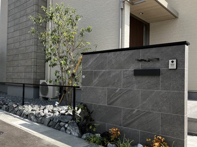 Y様邸のエクステリアは、洗練されたモダンデザインと機能性を高次元で融合させたプランです。家屋のシックな佇まいに調和するよう、全体をモノトーンとグレーを基調にまとめ上げました。