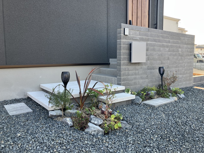 S様邸のエクステリアは、建物のモダンな印象と調和するよう、細部までこだわり抜いて計画されました。門柱にはダークカラーのモデリートを配し、クールグレーのエクティポストやシプレの表札が軽やかなアクセントとなり、スタイリッシュなエントランスを演出。