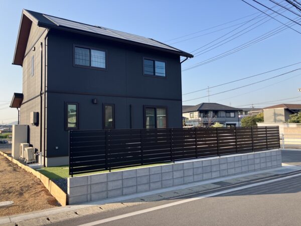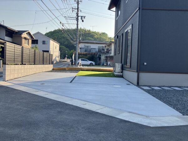敷地境界のCBブロック塀と横スリットフェンスは、プライバシーと防犯性を兼ね備えつつ外観との統一感を追求。機能的な土間コンクリート打ちの広々とした駐車スペースも、建物全体との調和を重視。ミニマルな美しさと実用性を高次元で融合させた、理想的なエクステリアがここに完成しました。