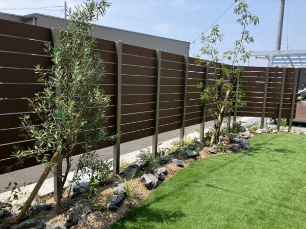 エコモックフェンスは高さ2000mmでプライバシーを保護し、グレージュ色の再生木板が落ち着いた雰囲気を醸し出します。植栽はオリーブやアオダモ、多様な低木・下草で四季の緑を演出し、クローバーターフの人工芝と割栗石、ウッドチップで手入れを軽減しつつ美しい景観を維持します。