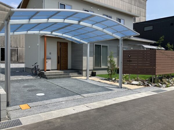 カースペースには熱線遮断屋根のカムフィエースワイドを設置し、ジャミコンクリートの洗い出し仕上げで美しさと実用性を確保。アプローチにはエクレルとヴィンテージウッドスリーパーペイブライトを配し、リル表札、ガーデンライト、照度センサーで安全性と上質な門構えを演出しています。