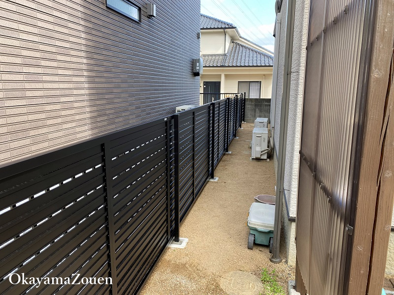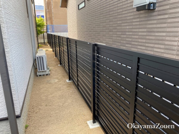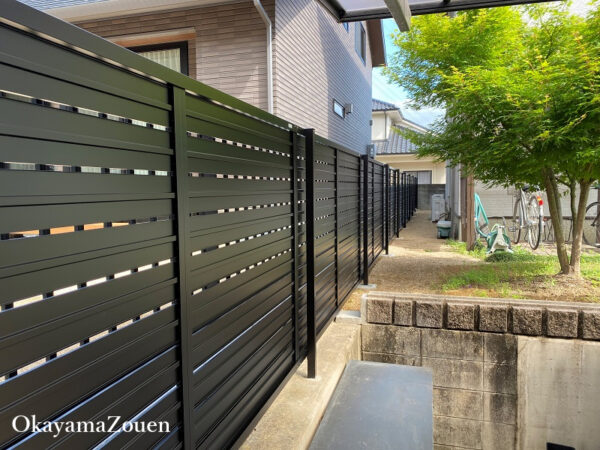 選定したのは、現代的な住宅外観に調和するスタイリッシュなブラックのフェンスAB YS3型です。このフェンスは、横スリットデザインが洗練された印象を与えつつ、外部からの視線を効果的に遮断します。特に、フェンス下部の隙間を従来のタイプより狭い60mmに設計することで、道からの覗き込み、ペットのすり抜け、さらには空き缶などのゴミの侵入などを防ぎ、日常生活における細やかな安心感に貢献します。また、外観だけでなく、内側から見てもすっきりとした美しい景観を保ち、圧迫感のない快適な空間を演出します。