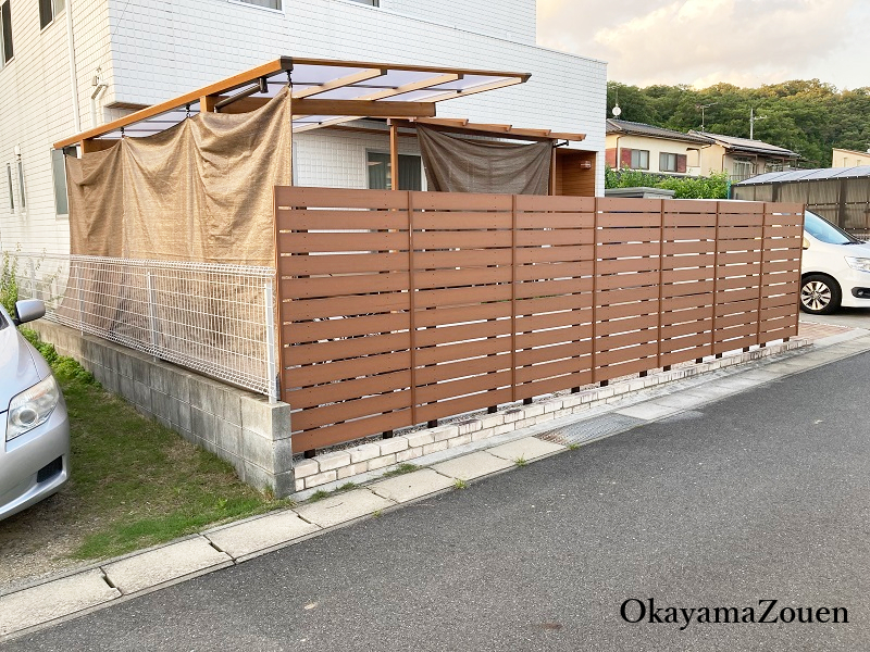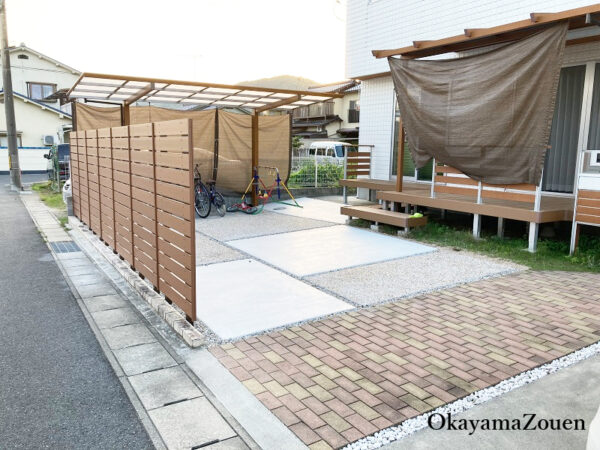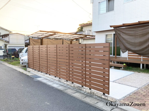 まず目を引くのは、チークブラウンのEフェンスです。既存の低い金網フェンスから高さのあるルーバータイプに変更することで、道路からの視線をしっかりと遮り、ご家族が安心して過ごせるプライベートな空間を確保しています。フェンスの木調デザインは、周辺環境にも調和し、温かみのある印象を与えます。