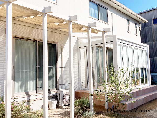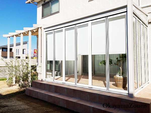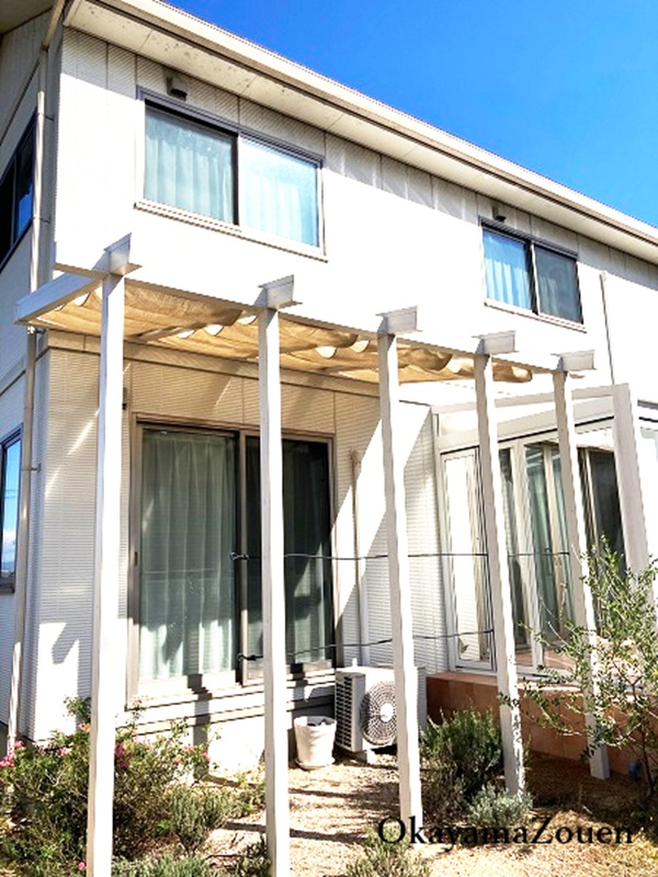 快適性向上のため、ハピーナリラ ロールスクリーンと日除けセットを設置しました。これらはプライバシーを確保しつつ、直射日光を遮り、一年を通して心地よい日陰を提供します。ホワイトのフレームカラーは建物外壁と調和し、洗練された印象です。
