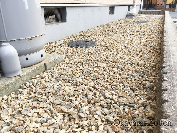 まず、お住まいの顔となる建物正面のスペースは、雑草の除去と防草シートの敷設を徹底し、その上に化粧砂利を敷き詰めました。以前は大きく育っていたイチジクの木も抜根し、足元をすっきりとさせることで、非常にクリーンで管理しやすい空間へと生まれ変わりました。見た目にも明るく、洗練された印象を与えます。