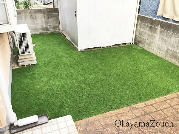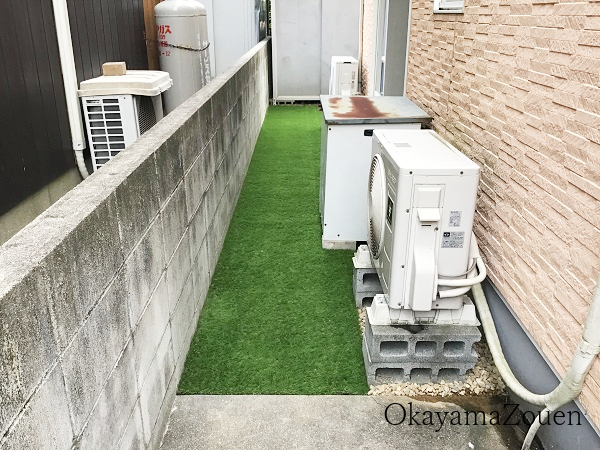 続いて、裏庭や建物の裏手に広がる通路、隣地境界に面した細長いスペースには、当社の高品質な人工芝を敷設しました。緑豊かな芝生が一年中楽しめるだけでなく、雑草が生える心配もなくなり、水やりや芝刈りの手間も一切不要です。お子様やペットが安心して遊べるスペースとしても最適です。
