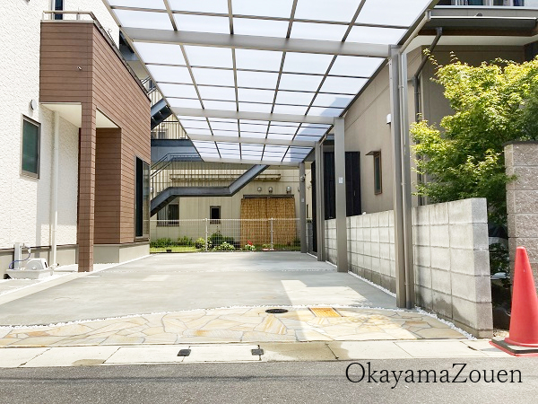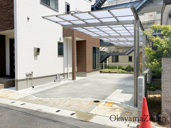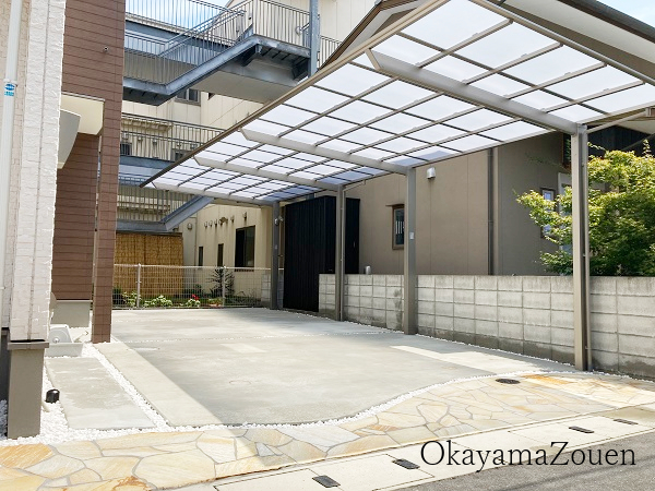 カースペースには、スタイリッシュな印象の ネスカF 縦2連棟 を採用し、機能的に2台分の駐車スペースを確保しました。屋根材には ポリカーボネート板(クリアマット) を選定することで、明るさを保ちながらも日差しを適切に和らげる効果も期待できます。