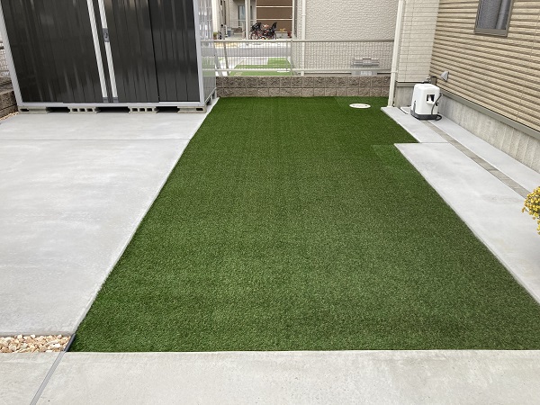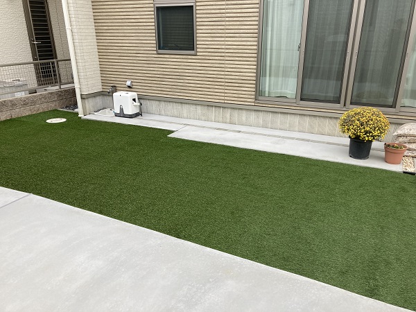 庭には、手入れ不要で常に緑が美しいクローバーターフ レギュラータイプの人工芝を敷設。お子様やペットが安心して遊べる快適な空間が広がります。