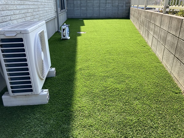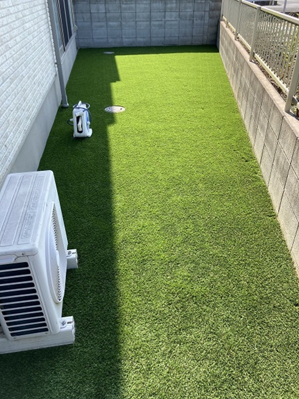 一方、広々とした裏庭スペースは、全面にクローバーターフのレギュラータイプ人工芝を敷き詰めることで、メンテナンスの手間を大幅に削減しながら、いつでも家族が安心して過ごせるプライベートな緑の空間を創出しました。この人工芝は、摩耗に強い芯入り型の芝糸を採用しているため、お子様やペットが走り回っても耐久性に優れています。さらに、特殊な遮熱成分を配合しており、日差しの強い日でも表面温度の上昇を抑制する機能があるため、裸足で歩いても快適です。人工芝特有のテカリを抑え、より自然なリアル感を追求した設計は、景観に調和しながら美しい緑を提供します。これにより、水やりや草むしりの煩わしさから解放され、年間を通じて手入れいらずの美しい庭をお楽しみいただけます。このプランは、日々の暮らしに寄り添い、お客様のライフスタイルを豊かにするエクステリアの提案です。