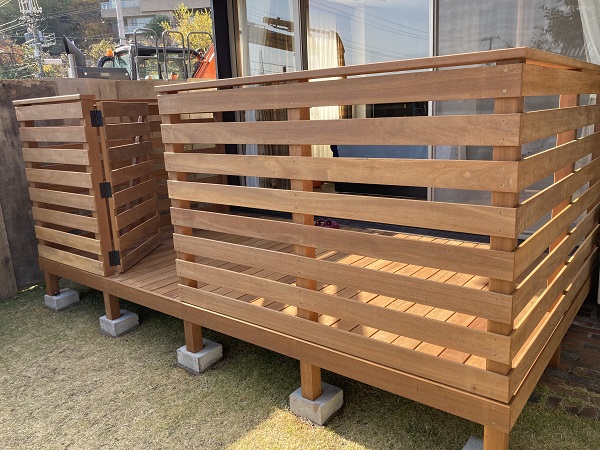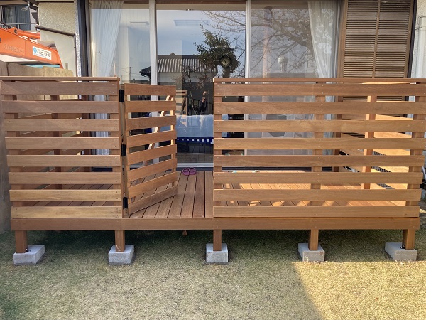 デッキを囲むように設置された囲いフェンスと扉は、プライバシーの確保とデザイン性を両立させています。フェンスは8段貼りのデザインを採用し、周囲からの視線を適切に遮りながらも、圧迫感を与えず、軽やかな印象を添えました。統一感のある扉は、スムーズな動線と空間全体の一体感を実現しています。