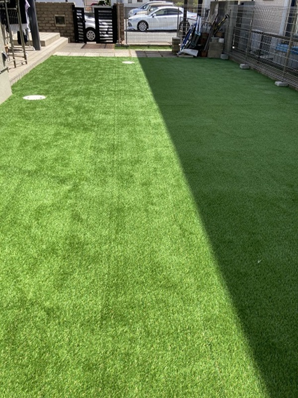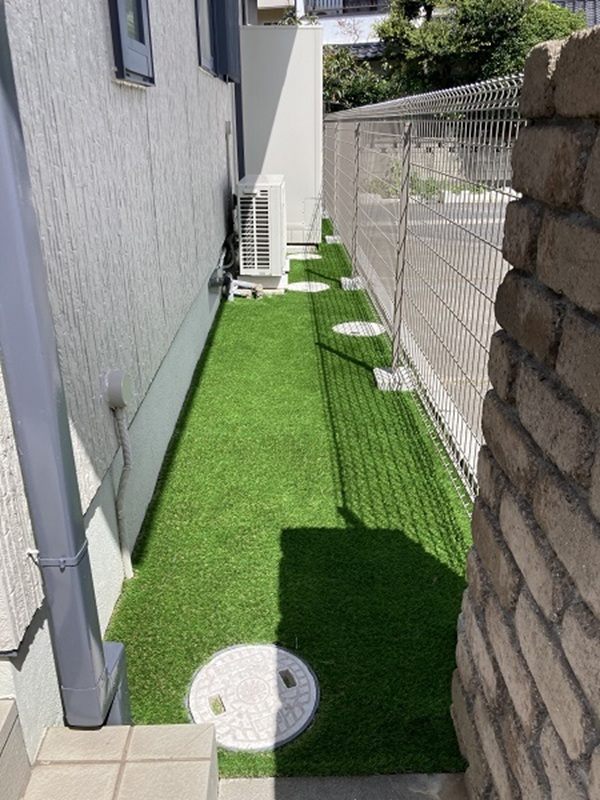 Y様邸のエクステリアプランは、広大な駐車スペースと快適なプライベート空間の創出に焦点を当てました。 メインとなるのは、4台駐車可能な奥行2連結のスカイリードです。屋根材には熱線遮断ポリカーボネート板(かすみ)を採用し、日差しを和らげて車内温度の上昇を抑える工夫を凝らしています。既存の人工芝との調和を考慮し、カーポートの支柱部分は精密な切欠き加工を施しました 。 もう一台分の駐車には、機能的なセルフィカーポートを採用。こちらも熱線遮断ポリカーボネート板の屋根材を使用し、使い勝手を向上させています。既存の土間状況に合わせてカッター入れや斫り、モルタル補修を行い、美しく収まるよう細部にまで配慮しています。 プライバシー確保のため設置した目隠しフェンスは、シャトレナⅡ 1型の2段施工です。シックなブラックの支柱にトラッドオークの木目調パネルを組み合わせ、木目調を建物側へ向けて配置することで、邸宅の外観と一体感のある温かい雰囲気を演出します。このフェンスも既存人工芝への切欠き加工を施し、全体の美観を損ねることなく設置されています。これらの要素は、お客様の日常に寄り添い、機能性とデザイン性を高次元で融合させた、質の高いエクステリア空間を形作っています。