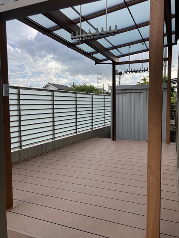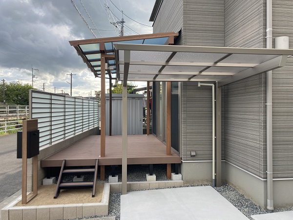 リビングから連続する形で設けたウッドデッキ「ひとと木2」は、ローズウッド色が温かみを添え、室内との一体感を生み出す開放的な空間です。その隣に壁寄せ納まりのテラス「ナチュレN」を配置し、熱線遮断ポリカーボネート板の屋根材により、日差しや雨を気にせず過ごせる快適な屋外リビングを実現しました。オレンジチェリー色のテラスとプラチナメタリックのスポットライトの組み合わせは、昼夜を問わず魅力的な雰囲気を演出します。