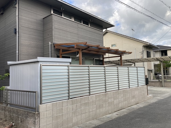 敷地境界には、ベージュ色の化粧ブロック「トーヨーイースワン」を5段積みにし、シャイングレーのフェンス「サニーブリーズフェンスS型」を組み合わせることで、プライバシーを確保しつつ、外観にモダンで調和の取れたアクセントを加えました。