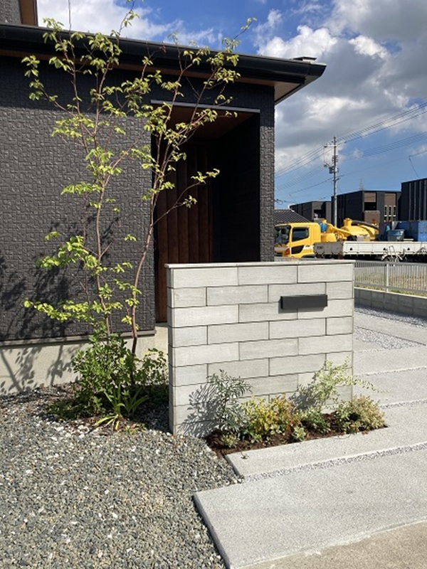 玄関の顔となる門柱は、スギーウォールを9段積み上げて安定感と重厚感を演出しています。笠置にはスギーキャップを用い、全体のデザインに統一感を持たせました。マットブラックのエメールポストは、前入れ後出しという使い勝手の良さとダイヤル錠による安心感を兼ね備え、デザインのアクセントとしても機能します。