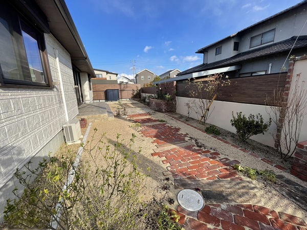 H様邸のエクステリアは、異なる質感を持つ素材を巧みに組み合わせることで、全体に調和と深みをもたらすデザインを追求しました。住まいの顔となるアプローチには、温かみのあるオールドレッドのイストブリックペイブと、時間の流れを感じさせる趣ある中古枕木を丁寧に配し、訪れるたびに新たな表情を発見できるような工夫を凝らしています。その隣には、クラリーイエローのカルムペイブを敷設し、明るく開放的な雰囲気を演出。視覚的な広がりを生み出しています。