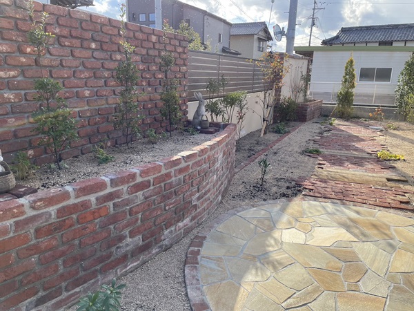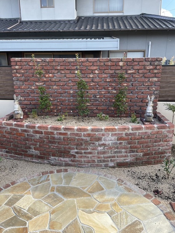 花壇は、イストブリック ウォールを様々な高さで積層し、立体的なデザインとしました。ここにレイランドヒノキやキンモクセイ、ヨーロッパゴールドといった豊かな高木を配し、足元にはラベンダーやローズマリーなどの低木・下草が、四季折々の彩りと香りで空間を豊かに彩ります。