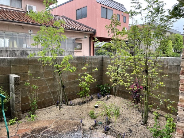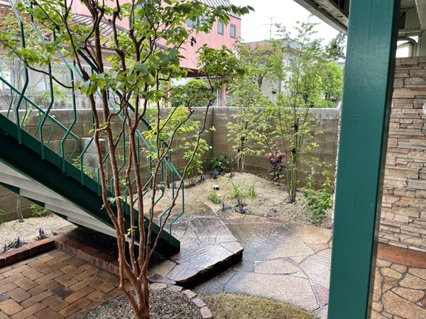 特に注力したのは、実用性と美観が両立する排水計画です。地中には暗渠パイプを埋設し、既存のブロックへ5ヶ所の水抜きパイプを設置することで、雨水の適切な排水ルートを確保しました。この細やかな配慮により、雨天時の敷地の快適さを向上させるだけでなく、植栽の健全な生育環境も維持し、長く美しい景観を楽しむことができます。