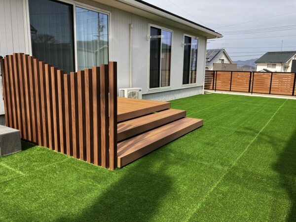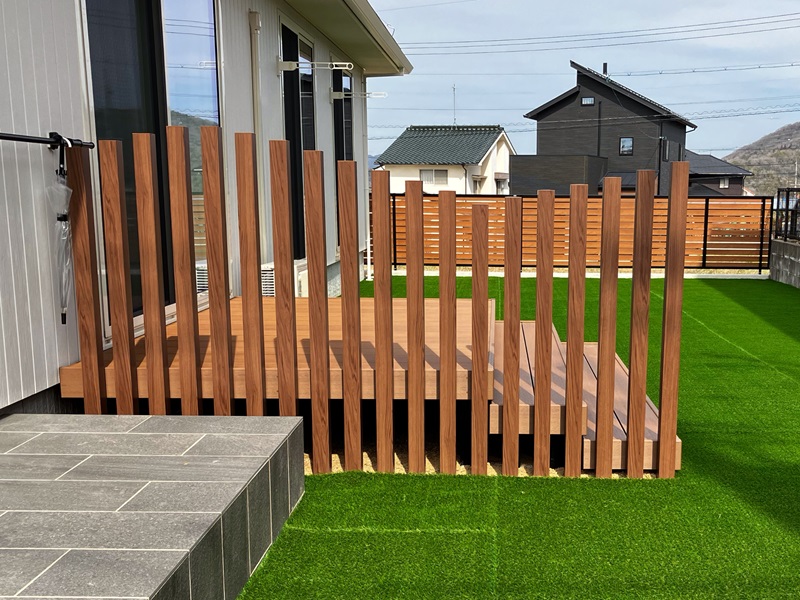 デッキに隣接する部分には、手入れの負担が少なく、年間を通して美しい緑を保つことができる人工芝「クローバーターフ」を選定しました。これにより、常に瑞々しい景観を維持し、視覚的な心地よさを提供します。また、境界に設けたスクリーン「枕木材」は、クリエモカの色調と細やかなピッチが、適度な目隠し効果を発揮しながらも、軽やかな印象を与え、空間に奥行きを生み出します。