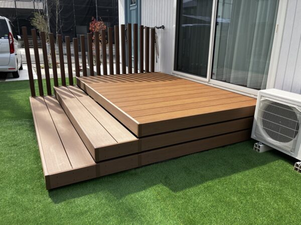 H様邸のエクステリアプランは、日々の暮らしに豊かさをもたらすことを目指し、各要素を丁寧に配置しました。中心となるのは、広々とした屋外空間を演出する人工木のウッドデッキ「ヴィラウッド」です。コルクブラウンの落ち着いた色合いは、邸宅の外観と自然に溶け込みます。二段デッキの独立納まりと、足元をすっきりと見せる床下囲いは、デザインの洗練さを際立たせつつ、機能的な広がりを提供します。