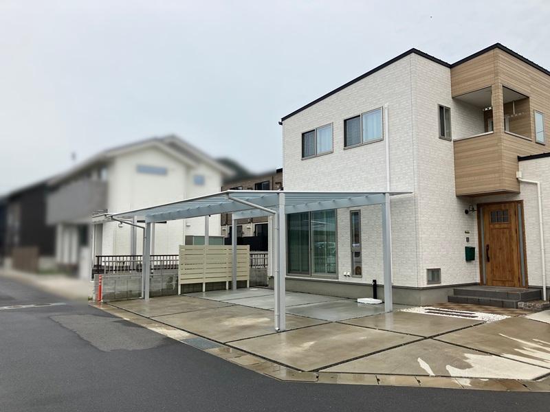 A様邸のエクステリアプランでは、新築建物の魅力を最大限に引き出し、機能性と美観を両立させることに注力しました。カースペースには、両側支持タイプのカーポート「スカイリード」を採用し、屋根材には熱線遮断ポリカーボネート板のかすみ調を選定しています。これにより、夏の強い日差しを効果的に遮りながらも、柔らかな光を取り込むことで、駐車スペース全体を明るく開放的な雰囲気で保ちます。特筆すべきは、建物の換気部分への干渉を避けるため、カーポートの奥行きを切詰加工した点です。これにより、機能性を損なわずに敷地形状に合わせた最適な収まりを実現し、細部へのこだわりを表現しています。