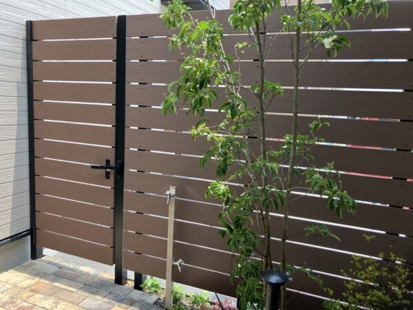隣地境界の目隠しは、プライバシーと景観美の両立を重視しました。温もりあるエコモックオリジナル再生木板(ブラウン)エコモック門扉を配し、プライベート空間の独立性を高めました。