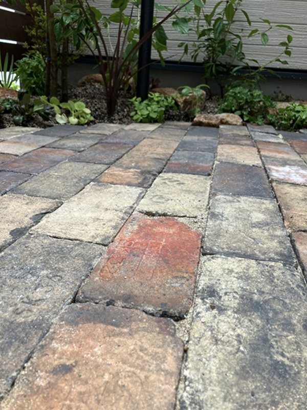 リビングから繋がるテラスは、御施主様支給のレンガが温かい屋外リビングです。足元には、細部にこだわったフィリップベースと**ドゥーステップ(グレーベージュ)のステップを設置。利便性を考慮し、機能的なアクアルージュW(ベージュ)やステーク50(ステンカラー)**などの立水栓を効果的に配置しました。