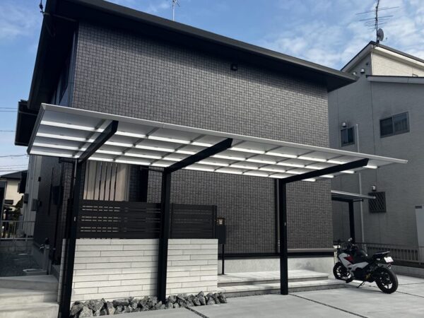 全体をダークグレーとホワイトで統一し、都会的でシャープな印象を演出。2台分のカーポートは敷地に合わせて配置され、デザイン性と使いやすさを両立しながら、建物の外観を引き立てる存在となっています。