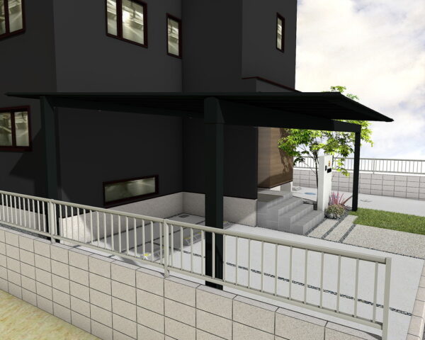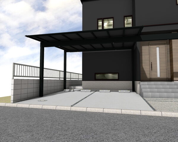 S様邸の駐車スペースには、マットブラックの屋根材が美しいスカイリードカーポートを採用しました。両側支持タイプで、梁を延長し前側に移動することで、限られた空間でもデザイン性と使い勝手を両立。柱部分は既存の土間コンクリートを丁寧に補修しており、新設部分との一体感を演出しています。広々とした空間は愛車を優しく包み込み、毎日の出入りを快適にサポートします。