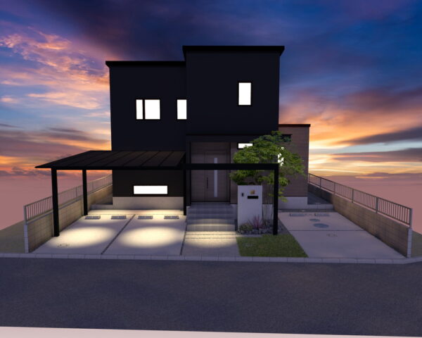 夜の景観を彩る照明は、カーポートの梁下にダウンライトを5灯配置しました。これにより、夜間のS様邸を優雅にライトアップし、駐車時の安全性はもちろん、住まいの表情を豊かに演出します。柔らかな光が足元を照らし、空間に奥行きと温かみをもたらすことで、昼間とは異なる幻想的な表情を醸し出します。機能性とデザイン性を兼ね備えた、光のプランニングです。