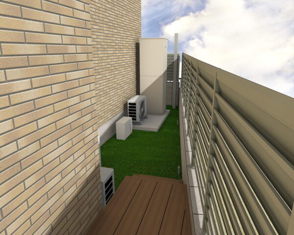 お庭には、お手入れが簡単なクローバーターフの人工芝を敷き詰め、年間を通して美しい緑が楽しめる空間を創出しました。室外機周りには沼田みかげの化粧砂利を配し、見た目の美しさと機能性を両立。既存のタイルデッキも一部改修し、より使いやすい動線を実現しています。