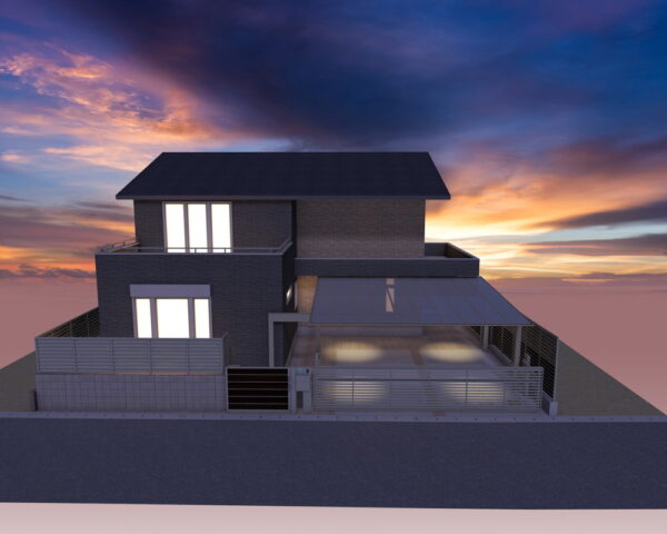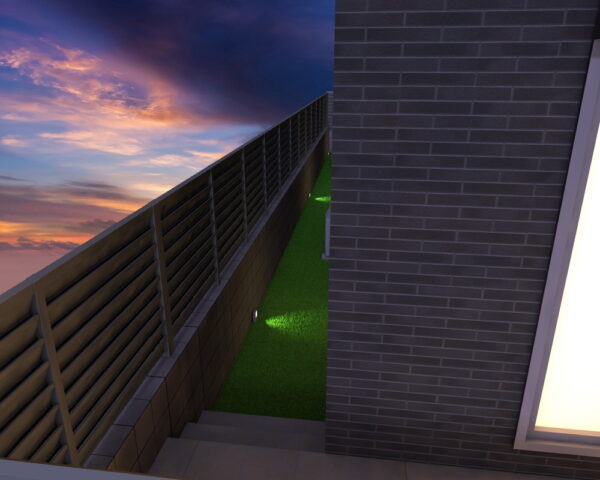 夜のエクステリアを彩る美彩スパイクフットライトを5灯設置し、空間に奥行きと温かみを加えました。足元を優しく照らすことで、夜間の安全性も向上。カーポートのダウンライトと連動し、夜間も安心して過ごせる光の演出で、K様邸の魅力を一層引き立てます。